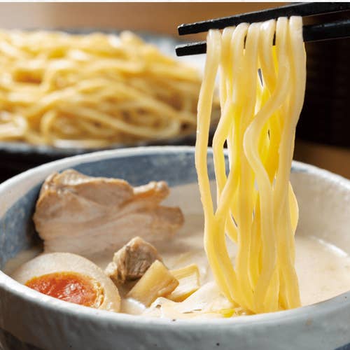 麺は自家製の十二番太麺を使用し、カンスイを効かせたモチモチ食感が魅力!